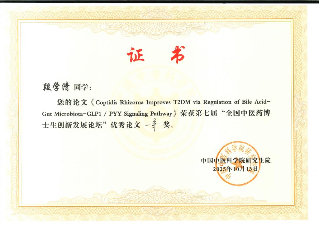 会上,我院2023级博士研究生段学清(导师田维毅教授)在论文交流展示中展现出良好的科学素养和研究能力,其论文《Coptidis Rhizoma Improves T2DM via Regulation of Bile Acid-Gut Microbiota-GLP1 / PYY Signaling Pathway》获评本次论坛“优秀论文一等奖”。