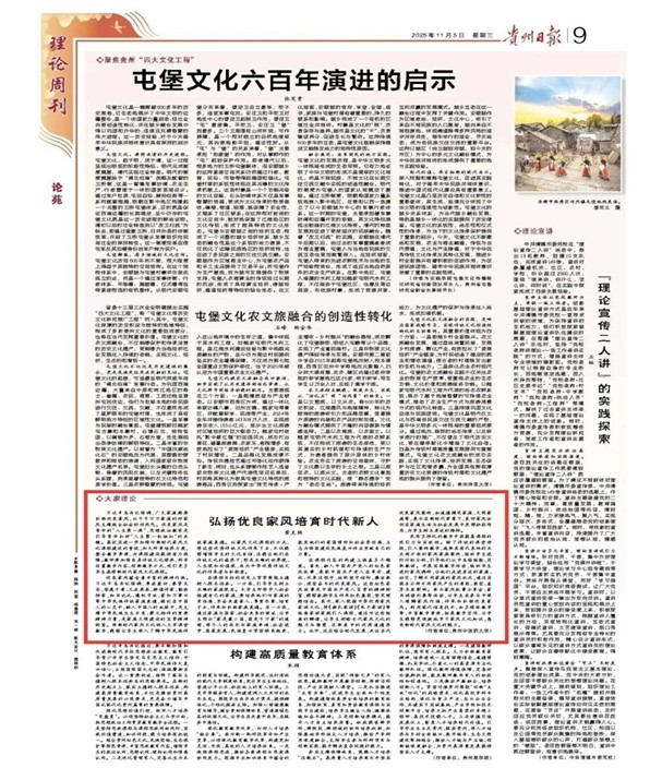11月5日,《贵州日报》在“理论周刊”刊发我院医古文教研室黄克艳老师撰写的理论文章《弘扬优良家风培育时代新人》。文章深入贯彻习近平总书记关于家风建设的重要论述,紧密结合高校“立德树人”的根本任务,深刻阐述了优良家风在大学生思想政治教育工作中的重要意义。