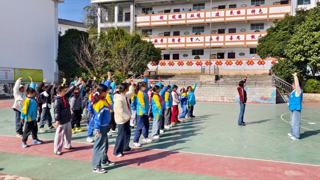 在“八段锦教学”环节,老师通过生动讲解,向学生们介绍了这项传统养生功法的千年传承。随着舒缓音乐的响起,学生们在老师的示范下认真模仿每一个动作,从“双手托天理三焦”到“摇头摆尾去心火”,一招一式虽显稚嫩却格外专注。许多学生表示这是第一次接触传统养生功法,在亲身体验后,感受到了中华传统体育项目的独特魅力,纷纷表示要将这项强身健体的方法带回家与家人分享。